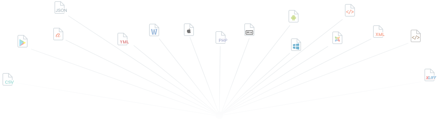 We support over 100 file formats, including .md, .xml, .json, .csv, .php, .yaml, .properties, .android, gettext, and .strings.
