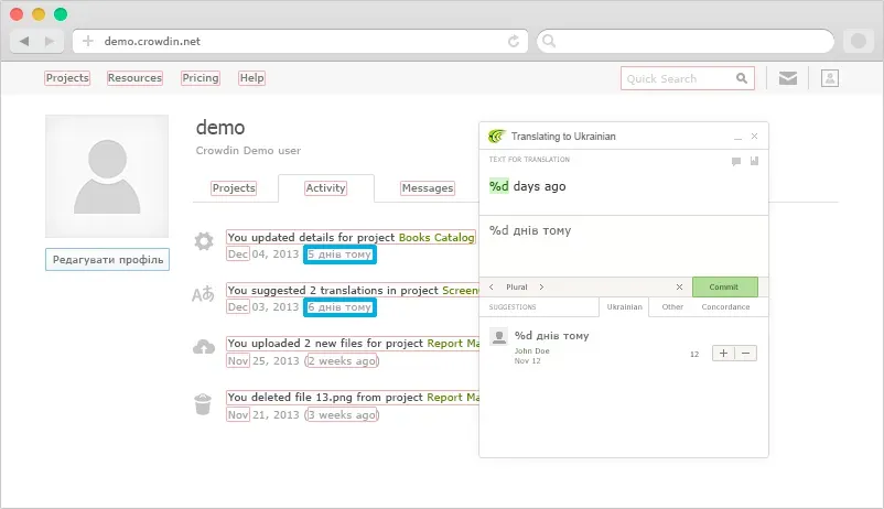 The translation process is accomplished via minimized regular Crowdin translation page with all the functionalities (proofread/vote option, comments, terms, etc). Additionally it is easy to review translations for proofreaders and assure quality for QAs that way.