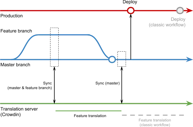 crowdin-cli upload sources -b {branch_name}That new branch is visible to translators also but contains only difference comparing to the “master” branch. Depending on the workflow you set, translators get notified about the new texts and start working. When the development is finished and developers “merge to master”, the translations can be downloaded from Crowdin as the following: